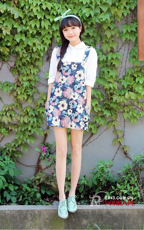看到绿幽幽的背景墙是不是很应景呢?初夏的时刻就是这样生机勃勃的,而图中的人儿更是甜美可人,花朵图案的背带裙可爱又俏皮,很有初夏的感觉哦,搭配白衬衫,可爱的发箍瞬间让你回到少女时代。