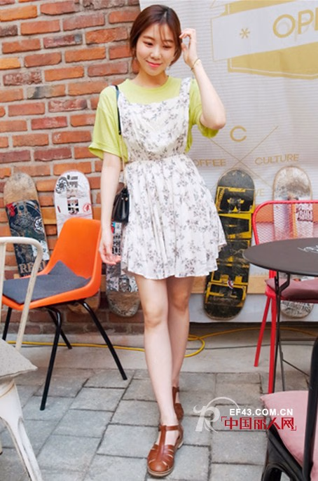 这款则是韩版小清新碎花收腰背带连衣裙,胸前的背带设计较为保守,芥末绿色的宽松T恤打底,更有了初夏的清爽感,极收腰的款式衬托出纤细的腰身和完美的身材比例,很有邻家女孩的气息哦。