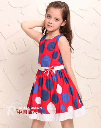 大波点色彩不同大小不一,错落有致排列,带着梦幻气息与动感。强对比度的红蓝配色极具视觉冲击力,有白色过渡不过分艳丽。蝴蝶结点缀白色腰封,呼应着白色褶皱裙边,清新至极。