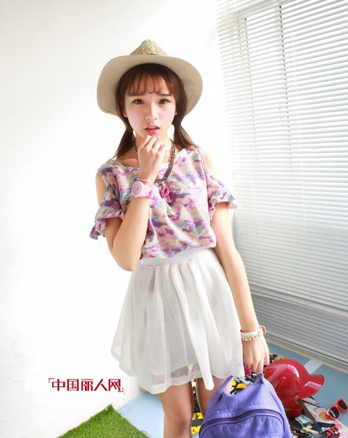 迷彩风的款式也能有百变的态度,这款设计成露肩的T恤,让迷彩风成为今年一款特别的流行风,女生穿起来有种别样的帅气!露肩的设计,清凉而不失小性感!配上蓬蓬短裙,将下摆塞进裙子里,凸显身段还能成功减龄呢。