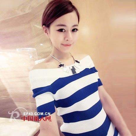 一字领保持刚刚好的尺度和分寸,露一点,遮一点,让性感和清新都在浓淡相宜之间。宝蓝色与白色的宽条纹相间融合,既能衬托纤瘦的身材,还可以让肤色洁白无瑕,这个夏日,微微性感起来吧。