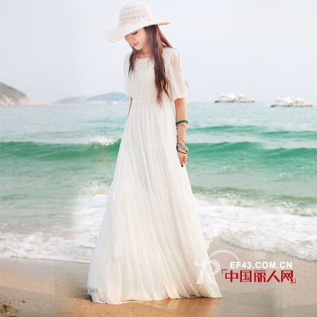 白色的帽子小木耳花点缀,甜美清新。搭配的这件2014年的春夏新款白色连衣裙,将波西米亚风格演绎的淋漓尽致。灯笼袖时尚美观。轻盈的质地,舒适的面料,如丝滑般的雪纺,风琴褶的设计,让人一见钟情再见倾心。