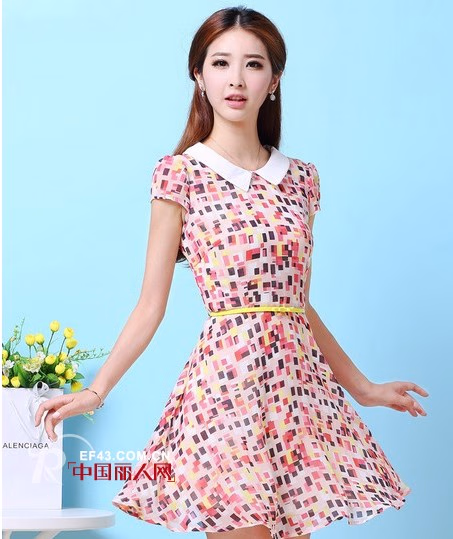 拼色印花不是没出现过,但是韵律感却没有这么强烈,几何图形的收缩叠加色彩零碎而有迹可循,比起大珠小珠落玉盘也并不逊色。纯白色娃娃领在繁杂色彩中独具一格,凸显细节元素的重要性。