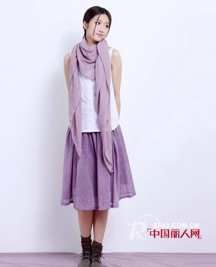 内涵很优雅,个性很随意,棉麻调的文艺范儿,纯纯然独具超然时尚的味道,不染指都市浮华,更能彰显内心的澄澈明净,唯有浅淡悠然的紫色,泛着丁香的幽幽馨香,让褶皱大摆超然于缤纷之外。