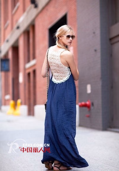 后背镂空长裙十分独特又显性感,蓝色和白色的搭配则给人清爽干净的感觉。