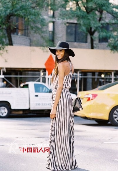 黑白永远是不会过时的经典配色,简单又大气。竖条纹更拉长了身材线条,再戴上一顶宽檐帽就可以去海边啦。