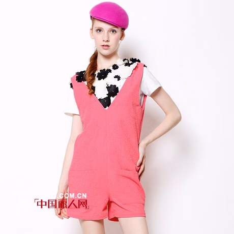 这样甜美的色彩,开衩的v字形,简约的款式,舒适的面料,适合各个类型的女生。搭配的白色t恤衫黑色的绣花装饰,为整体增添了成熟的色彩。混搭的玫红色帽子,尽显青春的气息。搭配一双帆布鞋就很有范儿。