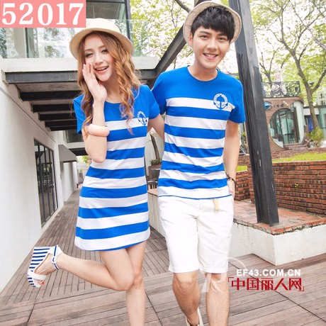 蓝色与白色相间的条纹装是小编最喜欢的撞色。不会过于低调,更不会十分的抢眼,恰到好处的色彩会给人带来舒畅的心情。修身的版型,就很是惹人爱。男生搭配的白色短裤,明亮的色彩给人留下阳光的印象。