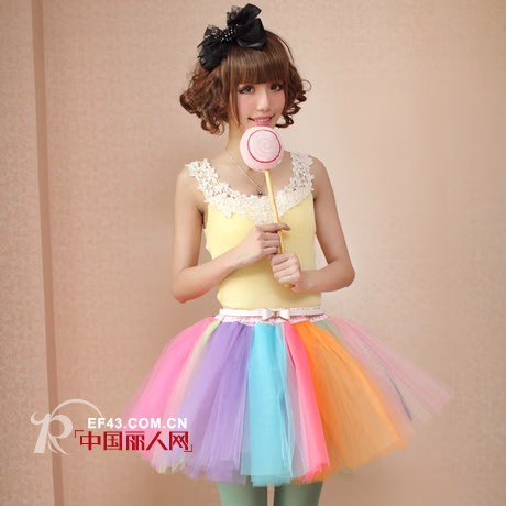 这件彩虹裙很是可爱,会不会很有原宿风呢?这样的蓬蓬裙怎么搭配都十分的吸睛。走在大街上,会引来高频率的回头哦。上身搭配的黄色吊带背心,蕾丝的肩带装饰,魅力十足。将甜美的日系塑造的十分到位。