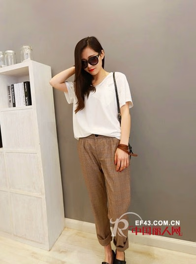 白色圆领T恤,松松垮垮的感觉非常休闲,非常适合气质慵懒的MM们。简单搭配卡其色棉麻哈伦裤,清爽显气质,胖瘦身材都能穿,超赞。