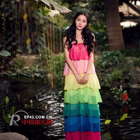 这件不规则的彩虹式条纹裙层层叠叠的渐变色彩,不走在哪儿, 都会是一道靓丽的风景线,让人无法拒绝的浪漫与纯美。露肩的设计,甜美中透露着性感。不管是及腰的直发还是波浪卷的短发,都有婉约的女神范儿。