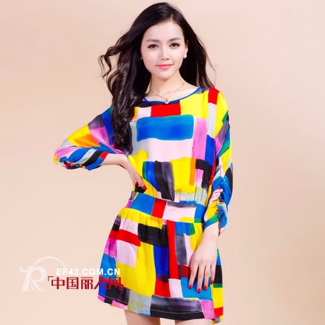 这件裙装是兮帛2014夏装新款。这件高端品牌的真丝连衣裙九分袖设计,十分的经典时尚。错乱的条纹很是考验人的逻辑思维,鲜艳的色彩,会让人过目不忘。彩虹条纹A字版型,搭配一双靓丽的高跟鞋,青春明艳。
