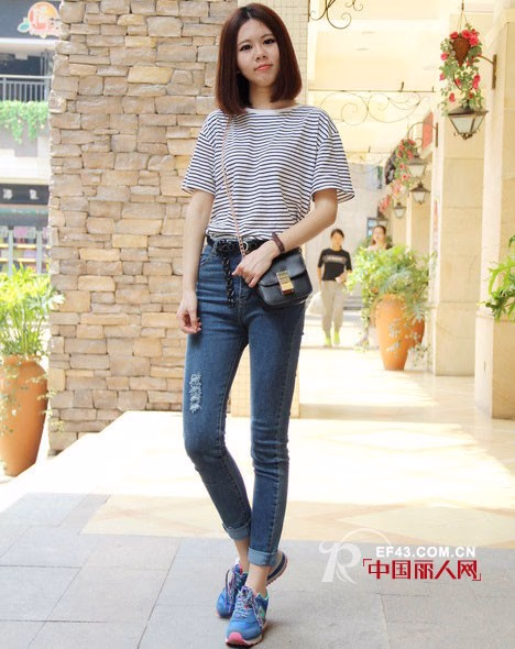 这一看就是学生妹纸的装扮,别看搭配的简单,但是如果没有下一番功夫,怎么会看上去青春靓丽呢?这款百搭条纹,搭配破洞牛仔裤,链条的小包也很百搭实用,休闲运动鞋也能穿出时尚的感觉。
