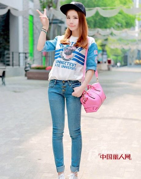这不是模仿韩版搭配的么,潮流的棒球帽和棒球服,宽松休闲,浅浅的蓝色在胸前还有一只可爱的小狗狗图案,实在是萌翻了,紧身的牛仔裤搭配拉长了线条,显瘦显高哦。
