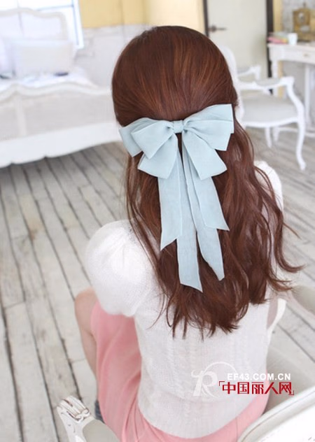 当你长发及腰的时候,把头发散下来,配个蝴蝶结可好,这样的卷发,这样的发质有没有不配一个发饰都觉得可惜呢?这款卷发配一个蓝色蝴蝶结发卡,夸张的发夹有没有很有女人味呢?配上甜美装扮绝对吸睛。