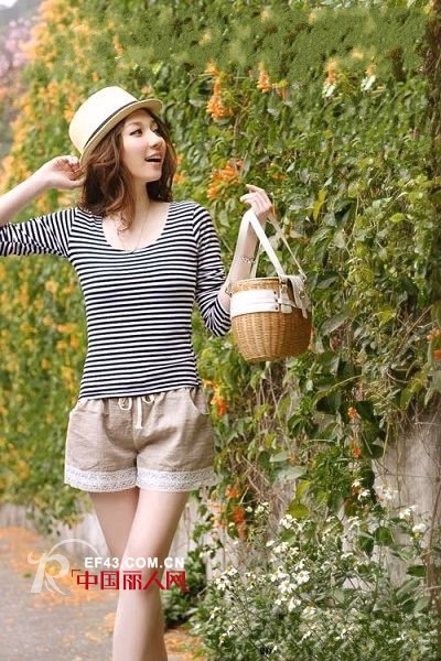 黑白的细条纹极为显瘦,让初春的你可以放心的减掉厚重的外套,穿上它也不会有赘肉哦。值得一提的是短裤的搭配,这是春夏季节绝对可以入手的麻质短裤,以可爱的蕾丝裤摆,up出本季独有的轻适relax女孩风格。