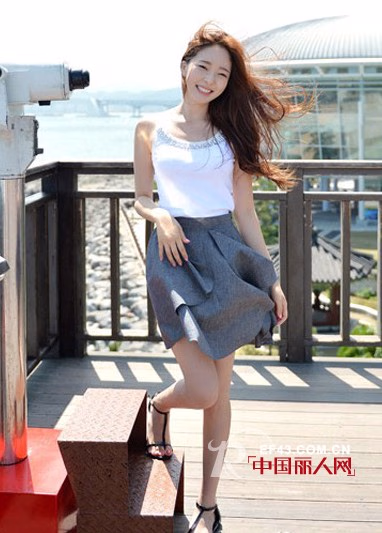 搭配示范:白色亮片背心+灰色高腰不规则半身裙+黑色平底凉鞋,背心领口亮面的设计适合单穿,搭配裙子休闲自在。