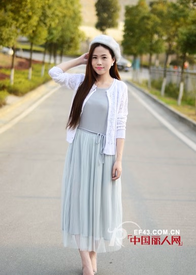 镂空的白色针织开衫,跟灰色连衣裙搭配显得特别仙气有气质,长长的纱裙,垂坠感极好,搭配一双灰色尖头高跟鞋,很淑女很浪漫。