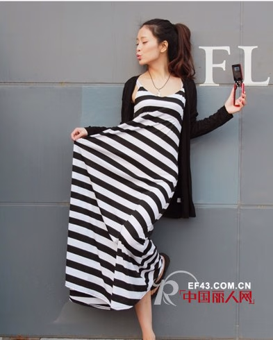 黑白条纹长连衣裙,简单的吊带背心设计,搭配黑色薄开衫,很有海边度假的休闲感觉,当然踏上一双人字拖就更加身临其近了,夏天来再这么穿。
