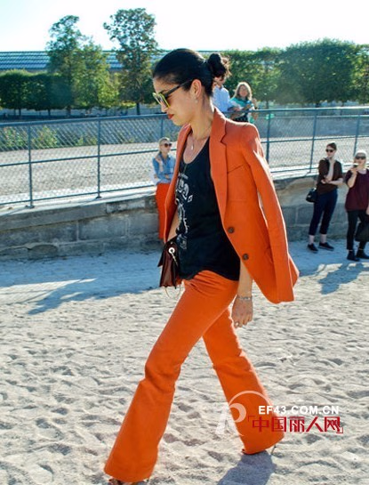 鲜艳夺目的橙色西装套装,内搭T恤或卫衣都十分舒适,这样的混搭且显得休闲年轻,无论是阔腿裤的优雅,还是小脚裤的随性,纯色套装都以极强的整体性大获全胜,而这里的阔腿裤绝对是占有身材上的优势的。