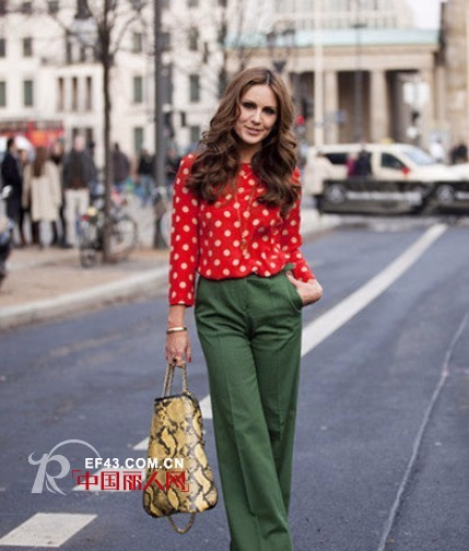 上身红色的波点衬衣和下身墨绿色的阔腿裤都有浓浓的复古怀旧风,在颜色的搭配上绝对是创新大胆,红配绿的穿法你敢穿吗?同时也能体现高雅的气质。谁说红配绿赛狗屁,我想那是因为你没有勇气穿出来吧,看看这位大胆的新时代女性,还有什么理由不时髦呢?