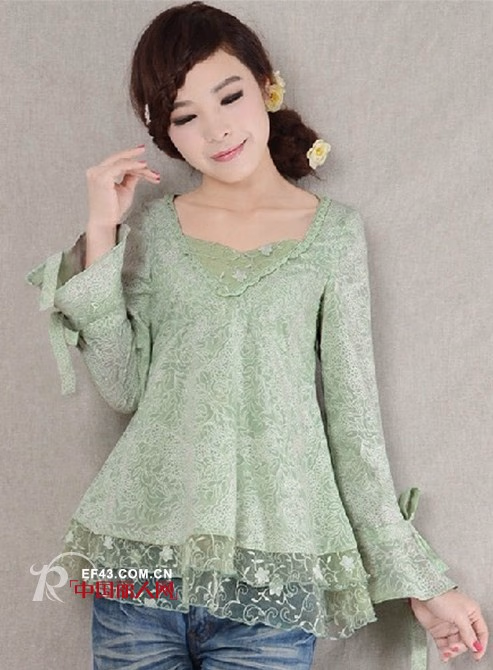 像上衣又像裙子的上衣清新的颜色很有春日的感觉,清新脱俗,舒适透气的面料并且带有暗花的精致设计含蓄温婉,领子的设计及袖子的设计以及下摆的蕾丝拼接都将女性的柔美和内涵诠释的淋漓尽致。牛仔裤的搭配见得比较混搭,如果配上小短裙会更加甜美。