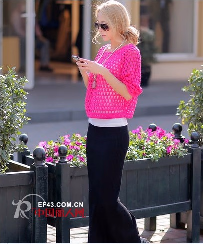 短款套头针织衫配鱼尾剪裁半身长裙,利用着装的比例来调整身材比例,达到塑造修长双腿的目的。玫红色与春天的花儿一样灿烂而娇媚,擅长展现女人味。镂空设计朦胧性感。