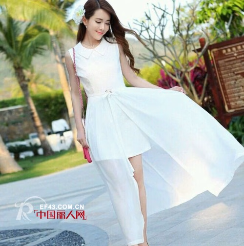 白色的长裙是女神的专属。清纯明丽的色彩,衬托的女人清新时尚。娃娃领的设计,收腰显瘦的款型,舒适的面料,让人十分的享受。轻盈的复合式加长裙摆的在风的吹动下摇曳着身姿,十分的灵动,像是坠落人间的天使。