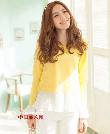 搭紧身裤造就高挑甜美范儿。利用风琴褶皱添上玉米黄的暖色调,与细碎镂空花纹一起展现甜美气质。白+黄假两件的撞色,丰富T恤层次感又为穿衣搭配留下线索,宜搭同色小脚裤,干净美好。