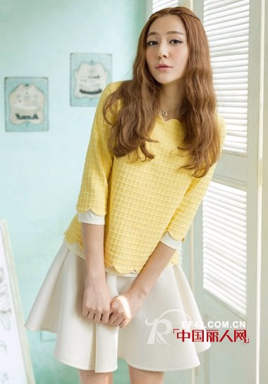 甜美的女生总是会给人留下很好的印象。怎么穿出减龄甜美感呢?这套搭配很是俏皮甜美。黄色的细节波纹九分袖套衫,花蕊领子的衬托,韩版的款式,下面搭配的白色百褶裙清新文艺,整体看上去就是一妙龄少女。如此的邻家亲切感,很惹人爱。
