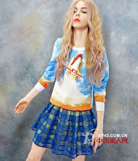 在趁着自己年轻的时候,怎么个性张扬都会是一种时尚的体现。这套装扮也很是吸引人眼球。彩绘的印花长袖衫呈现出了天空和火箭的颜色,十分的积极向上。下面搭配的镂空蓝色短裙伞裙的设计,个性时尚。搭配一双帆布鞋都很大方哦。