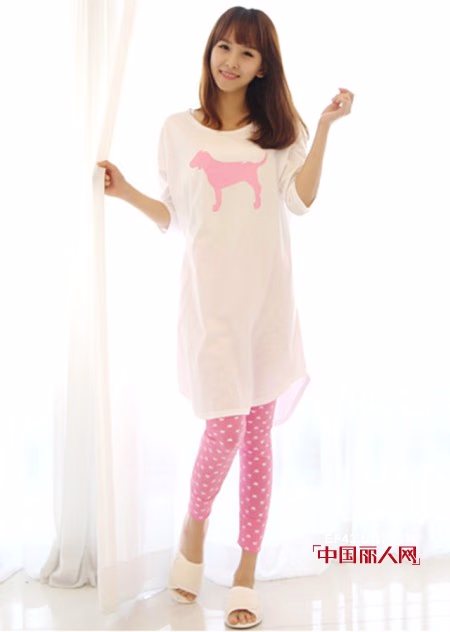 纯白色的超长款上衣,胸前可爱的动物图案装饰,纯棉的面料绝对呵护你的肌肤,超长的长度可以穿上这款波点的睡裤,天气热的时候,也可以抛开睡裤哦,一套衣服两种穿法,是不是毫无负担啊?