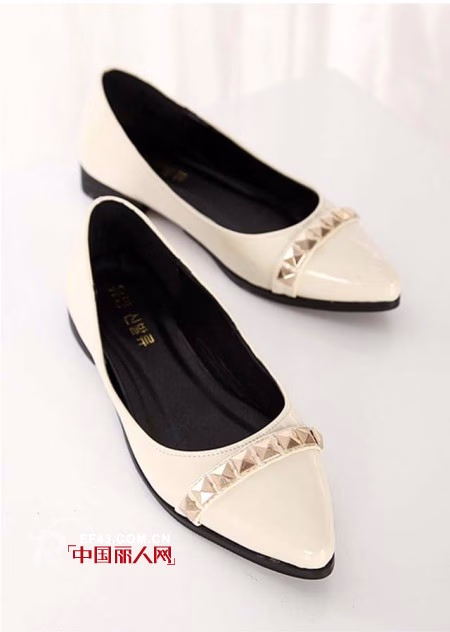 白皮黑底的尖嘴单鞋,人造的亮皮革,缓解疲劳的橡胶底,不会让你的脚在走了很久过后感觉到累,平跟浅口的款型适合不同的脚型,偏瘦、偏胖的都可以,在日常的休闲生活中都可以穿着,亮点是鞋口前方的一排铆钉,个性的装饰不再单调。