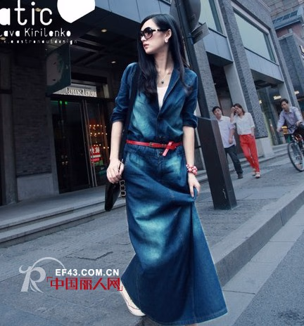 这件牛仔裙十分的个性时尚,不过会比较适合个高的女生。V领的设计,十分的性感,红色的腰带点亮了整体,也勾勒了女人的腰部曲线。长袖的设计,很是适合清明五一这样的天气,同样搭配一双高跟,魅力十足,尽显女王气质。