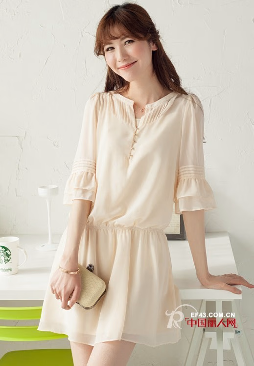 2014春装韩版新款雪纺淑女装七分袖小清新打底连衣裙~别样新材的设计,袖口处的小细节,都能提现这款连衣裙的独到之处。米白色的雪纺面料印衬出清新脱俗的气质,凉爽的春夏季,从一件雪纺连衣裙开始。