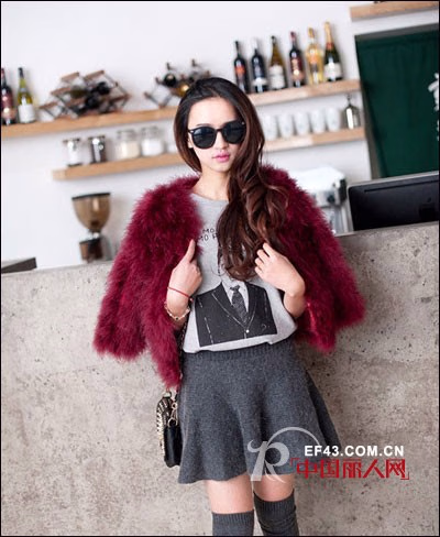 酒红色皮草短外套,质地轻柔时髦,穿在身上高雅大方。内搭人物图案打底衫,下穿百褶毛呢短裙,同色系过膝裤袜,甜美可爱,不失时尚感觉。就算你觉得自己还不适合穿的太成熟,但是这款皮草却不是成熟的单品,想穿出青春可爱也不是不可。