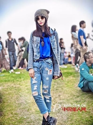 短款的牛仔外套搭配破洞牛仔裤,内搭蓝色真丝衬衣,柔美与硬朗的结合,短短的牛仔褂搭配嬉皮味道的破洞牛仔裤和黑色皮靴,小女子也可以这么帅气,灰色的毛线帽子和墨镜,以及名族风格的项链搭配也显得非常时尚摩登。