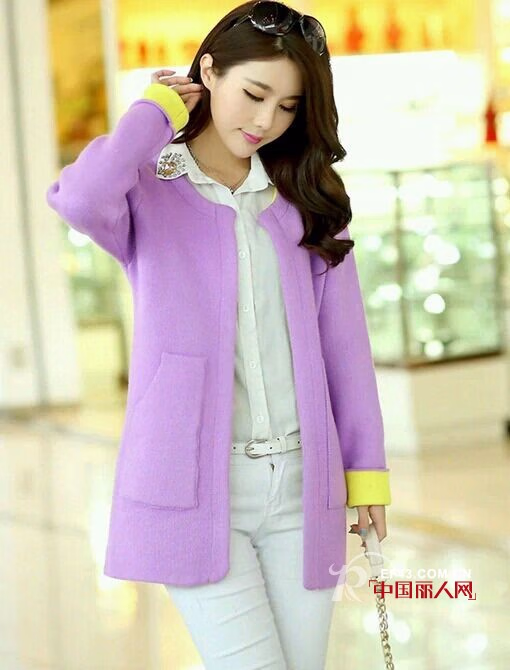 这件紫色的外套圆领的设计很是青春甜美,韩版的款式,适合各身材的女生。手袖处黄色的内衬翻出来为整体增色不少。里面搭配白色的绣花领衬衫,简约休闲。下面搭配白色的铅笔裤,将女人的身姿凸显的很是迷人。