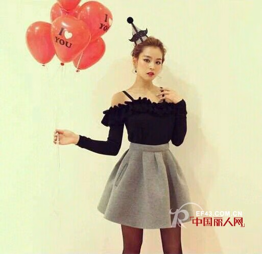 黑色的长袖衫,露肩的设计。两根黑色的吊带将女人的肩部衬托的白皙诱人。修身的版型,韩版的设计,将女人塑造的很是有魅力。下面拼接的灰色的伞裙,将腰部的曲线凸显的更加的迷人。下面穿上一条亮色系的紧身裤就很好看了。