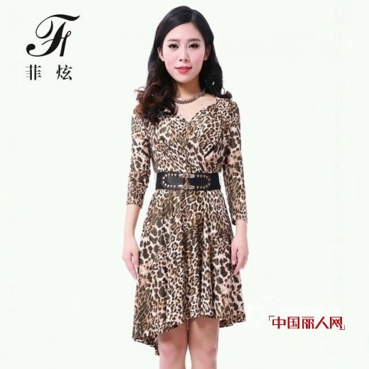 这件豹纹的连衣裙就是为爱时尚的你量身定做。犀利个性的豹纹将女人的甜美中融入了野性。收腰修身的版型将女人的身姿勾勒的很是有型。v领的设计和不规则长度的裙摆十分的性感独特。穿上一双黑色的高跟鞋,你就是女王。