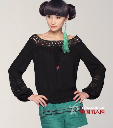 自然状态下不足以露出肩膀的一字领内敛却具小心机,领子顺着肩形滑落时的曼妙比直接裸露更具有诱惑力。镂空编织与彩色木珠点缀领口与袖口,为性感开启另一扇朦胧之窗。