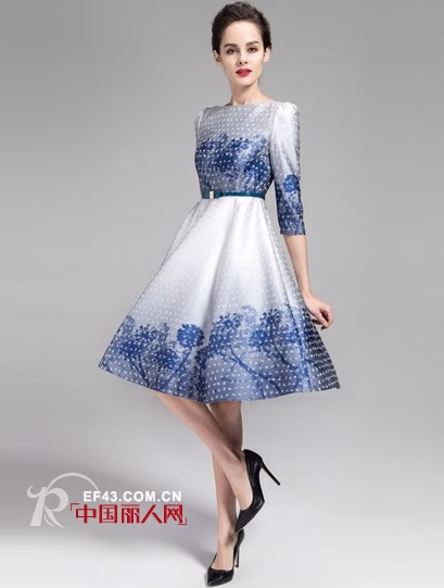 有助于营造氛围的渐变背景用的极为巧妙,与俏皮波点、格纹结合彻底与单调挥别。高腰伞裙刚好长及膝盖,有了浓厚的端庄与复古气息。艳丽但沉稳的宝蓝色印花提升高贵气质,与窄型一字领的庄重不谋而合。