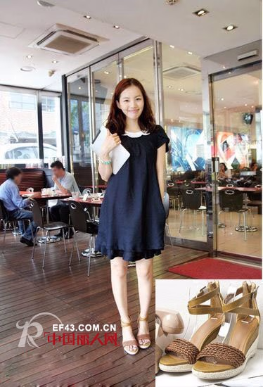 深蓝色泡泡质感的连衣裙相当的甜美,身材不甚完美的话还可以遮掩一下自己的小肚肚,叠层的裙摆律感十足,配上这款相当潮的编制元素凉鞋,低调的暗黄色不会抢掉衣服的风头,体贴的坡跟相当讨喜。
