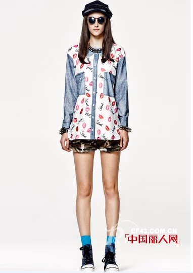 这套朋克风的装扮很是个性。圆领的设计,圆粒扣子的点缀为整体增加了分甜美的感觉。各式唇印小脚印的 个性图绘俏皮可爱。和牛仔的拼接多了分中性风格。下面搭配一件个性的花式皮裤,为整体增加了不少的时尚感。