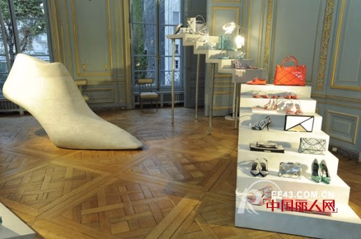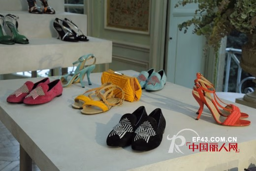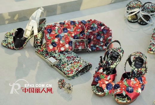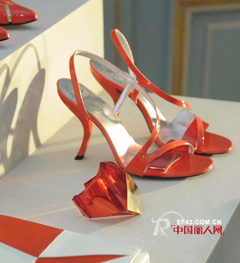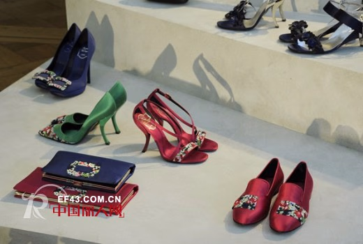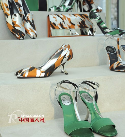Roger Vivier与设计师Bruno Frisoni合作推出了Rendez-Vous限量版鞋履。Rendez-Vous系列有标志性的逗号鞋跟,而且严格控制了4.5英寸的高度,令女人的腿部修饰达到最完美的程度。一双高跟鱼嘴鞋的后方各装饰了一朵丝绸桃色的花儿,还运用了PVC透明材质加上喷洒的油墨感彩色图案,芳艳动人。另一双黑色高跟鞋没有规律地布满了金属细管,与柳钉装饰的手拿包一起打造摇滚的乐趣,及膝长靴结合了暗灰色的金属鞋头,彩色的PVC透明材质和背部的绑带,视觉上尤其具有冲击力。