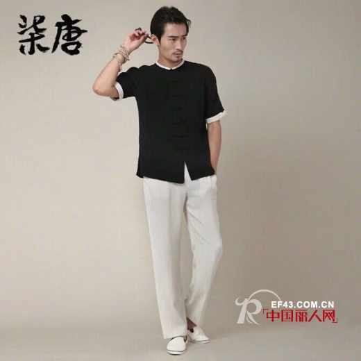 我们看到的这个品牌以唐装为主打,设计了一批批新改良后的唐风的服装。这件黑色的盘扣衬衫简约休闲。衣领和衣袖处的白色边缘点缀,为整体增亮了不少。下面米白色的休闲裤更是十分舒适得体,看上去就觉得十分的轻松舒适。