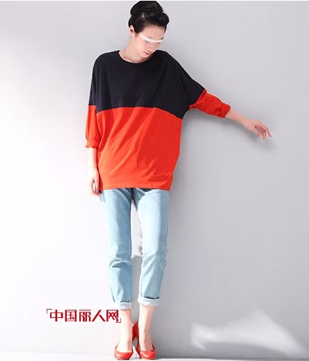 蝙蝠袖T恤有大大的肚量包容无处可逃的赘肉,双色拼接更将上半身这个整体给活生生掰成两半,具有收缩作用的深色将肩膀手臂部分收紧,膨胀的亮色将身体尺寸的宽大归责于色彩的问题。修身长裤上卷露出纤细脚踝,制造体重二位数的视觉效果你也能拥有。