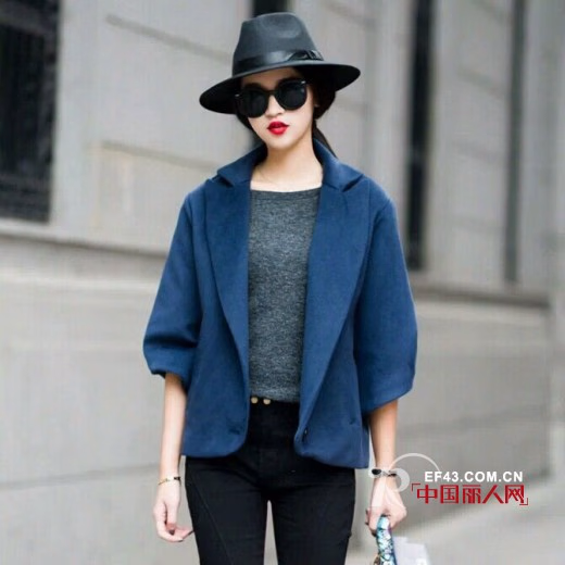 下面我们看到的是英伦风格女装。没有韩式风格的淑女感,却又自己独特的帅气风格。这件墨蓝色的外套中袖的设计,廓形的款式适合各种女生。里面搭配一件灰色的平领衬衫,下面一条牛仔裤,很是简约有型。帅气中性的英伦风适合你吗?