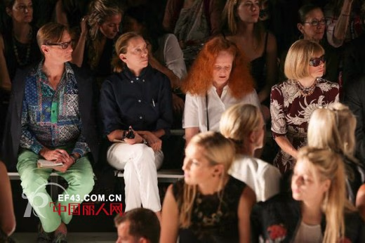 在Mary Katrantzou 2014春夏发表会场,Anna Wintour身旁坐的其爱将,如Hamish Bowles(右二),最近提拔的Eva Chen,就坐在Anna右手边。