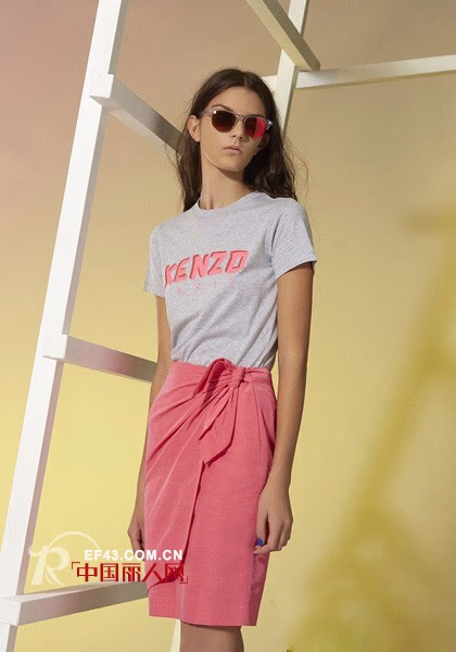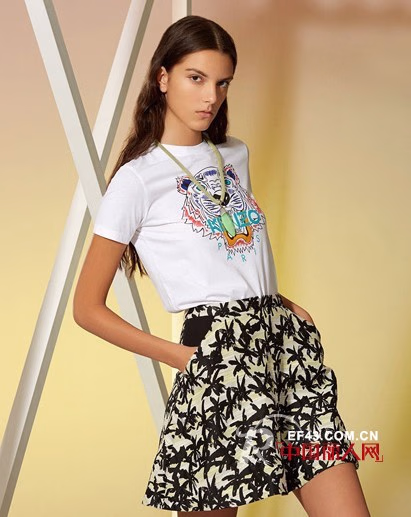 KENZO迷必备的老虎头T恤搭配充满夏日气息的印花高腰裙,青春的搭配在图案和袋口等细节设计上展现个性的魅力,模特黝黑的肌肤凸显健康的气息噢。